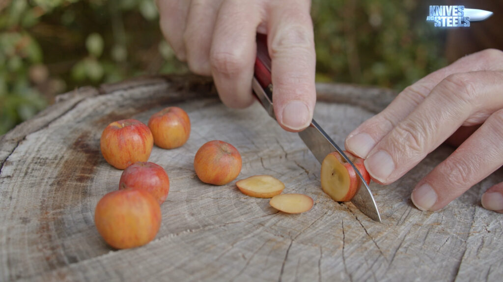 Je précise que la lame du couteau mesure 7 cm. C’est suffisant pour bon nombre de petites opérations de coupe. D’ailleurs le tranchant est très bon, on peut facilement couper des fruits et même s’attaquer à du bois.